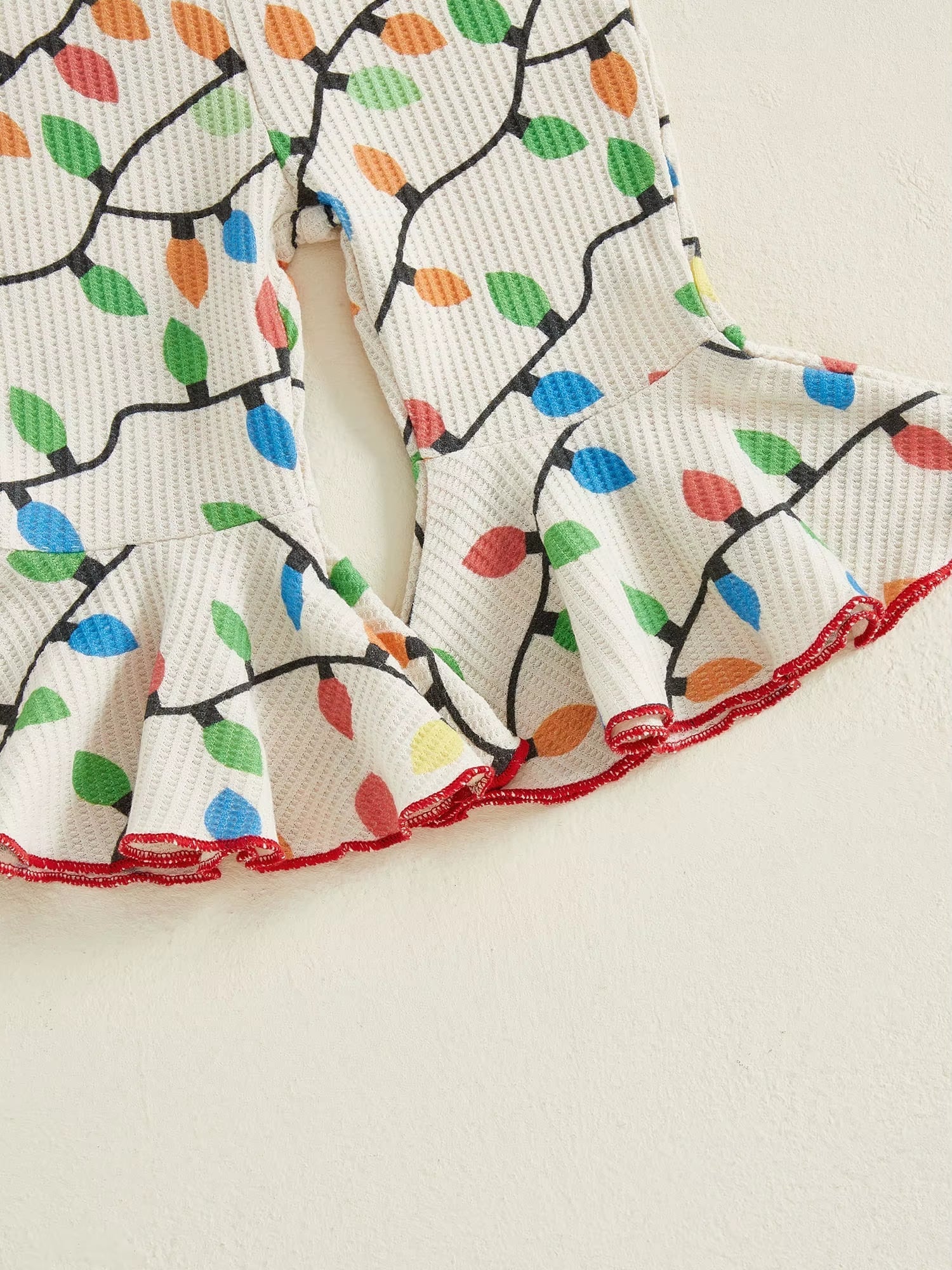 Celebrate the holiday season with these playful kids rompers! One features "Very Merry" on the front surrounded by festive Christmas lights, complemented by bell bottoms and tied shoulder straps for a fun fit. The other showcases "Thankful" on the front with a cheerful turkey design on both front and back, finished with a tie shoulders for easy wear. Both styles bring festive cheer and comfortable style perfect for little holiday spirits.